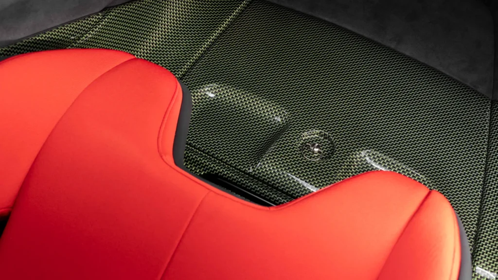 KupĂ©n Ă€r en symfoni av kolfiber, Kevlar, Alcantara och tekniska textilier â material som speglar bĂ„de dĂ„tid och framtid.
