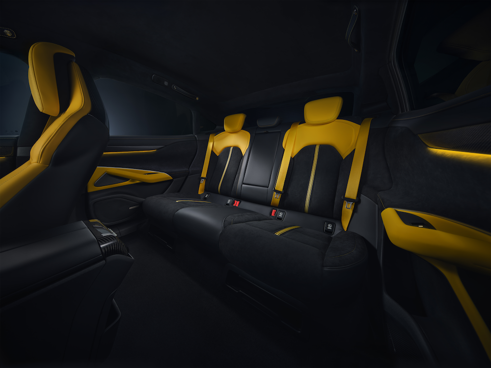 Föraren möts av nya sportstolar med förstärkt sidostöd, Alcantara över fem kvadratmeter, och en platt styrkrans i kolfiber med gult centermärke och röd “Boost”-knapp.
