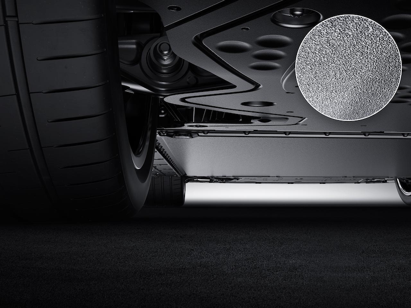Karossen använder över 5,5 m² kolfiber, inklusive ett 1,7 m² stort kolfibertak som sparar 11 kg vikt.